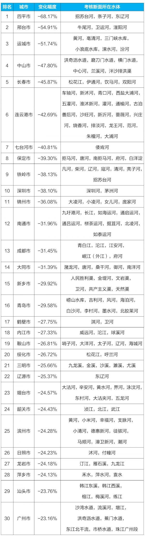 此外,从水质变化情况来看,四平(-68.17%)、邢台(-54.91%)、运城(-51.74%)、中山(-47.8%)、长春(-45.87%)等30城国家地表水考核断面水环境质量变化情况相对较好(从第1名到第30名)。