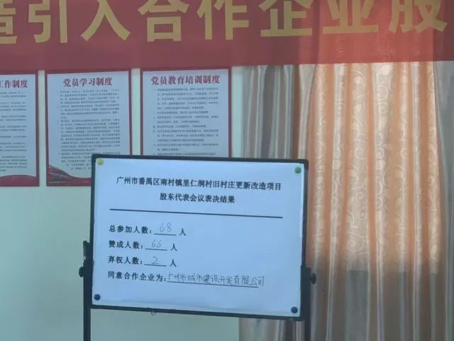 昨日下午2:30分,番禺里仁洞村旧村庄更新改造项目招商主体成员代表会议在该村会议室举行。根据股东代表大会表决结果,越秀地产获得里仁洞项目旧改资格!