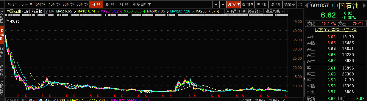 悲伤的投资者可能把中石油当作大盘蓝筹股来炒,因此坚定持有,殊不知,在石油价格低迷的时候,中石油股价也会迭创新低,如今中石油股价跌至6.60元,距其历史最低价6.04元还有不到一个跌停。