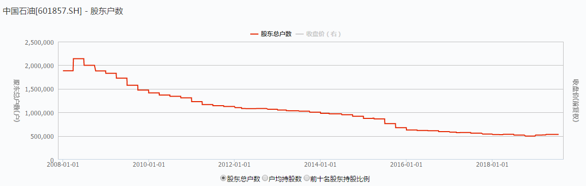 不过,随着上市以来股价持续下跌,投资者数量也逐渐减少,A股中石油似乎慢慢淡出了投资者的视野。数据显示,A股中石油投资者数最顶峰时,曾达到213万户,一路降至目前53万户。