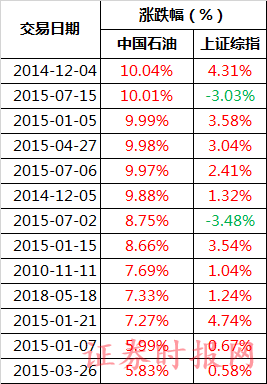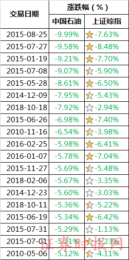 作为A股的超级权重股之一,其股价走势对A股影响自然也比较大。观察2010年以来中国石油和上证综指走势,可以看出,在中国石油大涨超过5%的时候,上证综指往往能实现上涨,但涨幅整体不大,甚至有时候中国石油大涨,大盘指数大跌,例如2015年7月15日和2015年7月2日,两次均跌超3%。