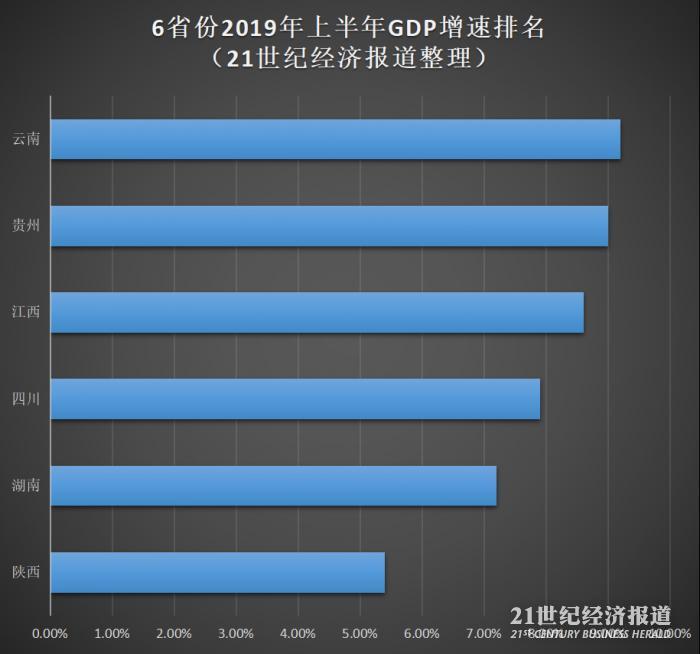同时,进一步从目前已公布的6个省份增速来看,紧随云南之后的是贵州,增长9.0%。贵州近年的GDP增速也非常迅猛,2018年为全国第一。此外,江西为8.6%,四川为7.9%、湖南为7.2%,而同在西部地区的陕西,表现不如云贵川,上半年仅增长5.4%。