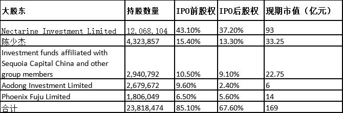 上市后,该五大股东持有股份及“身价”情况分别是:腾讯旗下全资子公司Nectarine Investment Limited持股37.20%,市值93亿元;创始人兼CEO陈少杰持股13.30%,市值33.25亿元;红衫资本及其他机构成员持股9.10%,市值22.75亿元;奥飞娱乐董事长蔡东青持股2.40%,市值6亿元;Phoenix Fuju Limited持股5.60%,市值14亿元。首发上市后,原五大股东合计持有67.60%股权。