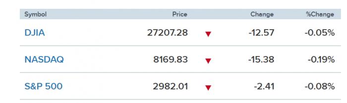 美股财报季持续展开,企业成绩单有喜有忧。当地时间周四开盘,美股三大指数集体低开,但跌幅较小。截至发稿,道琼斯工业平均指数跌0.05%,报27207.28点;标准普尔500指数跌0.08%,报2982.01点;纳斯达克指数跌0.19%,报8169.83点。