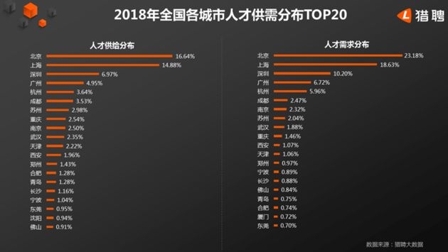 对高端人才的需求愈强烈,也意味着城市前景愈明朗。此前猎聘发布的《2019年人才前景趋势大数据报告》显示,2018年人才供给和需求占比排名最高的20个城市中,除北上深广外,其他都是近年发展迅猛的新一线城市,其中杭州和成都领衔,位居榜单第五、六位。