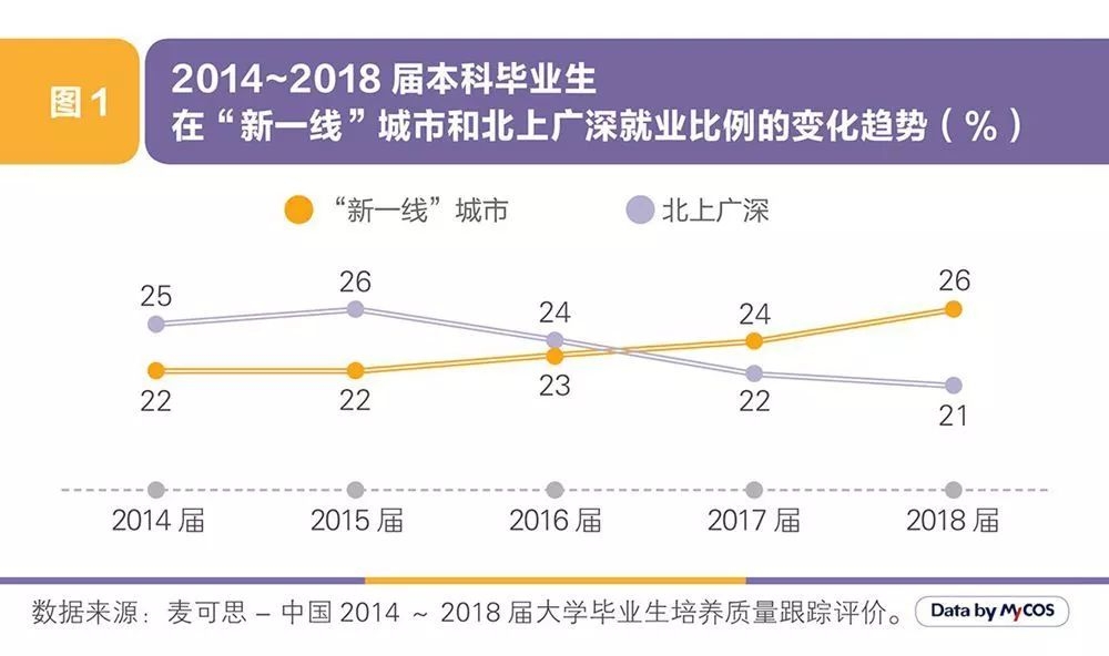 根据上述就业报告,近年来应届本科毕业生在“新一线”城市就业比例从2014届的22%上升到2018届的26%,在北上广深就业比例则从2014届的25%下降到2018届的21%。