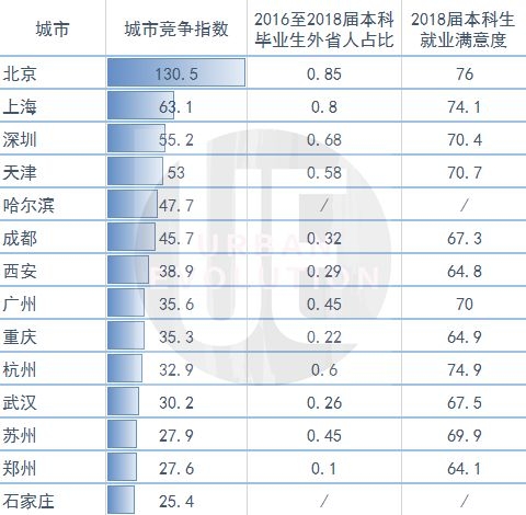 而麦可思研究院此前发布的2019年中国大学生就业报告(下称“就业报告”)也显示,北京、上海及深圳等一线城市外来人才占比较大,毕业生就业满意度也较高。