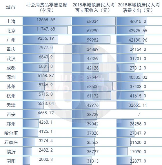 从2018年社会消费品零售总额来看,16座城市中,上海、北京、广州占据前三甲,分别为12668.69亿元、11747.68亿元、9256.19亿元。新一线城市中,重庆、武汉、成都同样表现不俗,分别位居第四、五、六位。深圳虽然是一线城市,社消零总额却跌出前五,以6168.87亿元排在第七位。