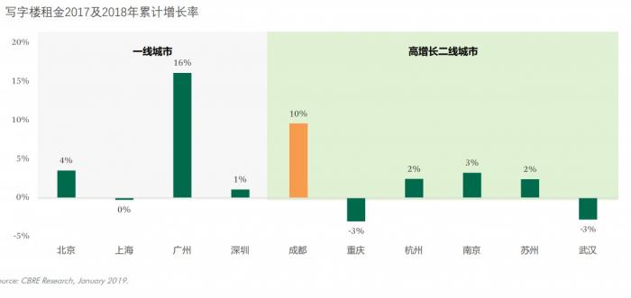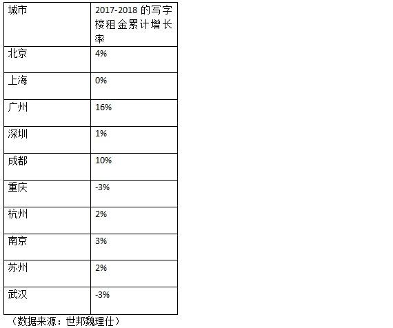 10城写字楼租金增长率排名:广州、成都大幅度领先