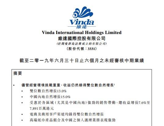 7月18日,维达国际(3331.HK)发布截至2019年6月30日之未经审核中期业绩。报告显示,上半年维达国际实现收益78.91亿港元,同比增长7.6%;毛利为22.17亿港元,同比增长1.8%;净利润同比增长5.4%至4.4亿港元。