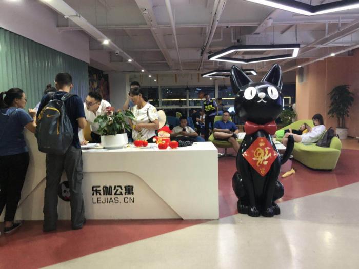 7月18日,虽然资金链断裂信号频出,但乐伽公寓位于南京建邺区的总部办公室,仍然有员工正常上下班。在这一整层被租下的办公室内,装修风格年轻时尚,进门可见公司吉祥物——一只黑色的大猫。办公区域内不仅有乒乓球台活动室,还有一间宠物室。宠物室内有一只白猫和灰色花猫。两只猫并未感受到外面的暗涌,安逸地躺在猫蓝里。来维权的房东、租客偶尔也会隔着玻璃逗逗它们。