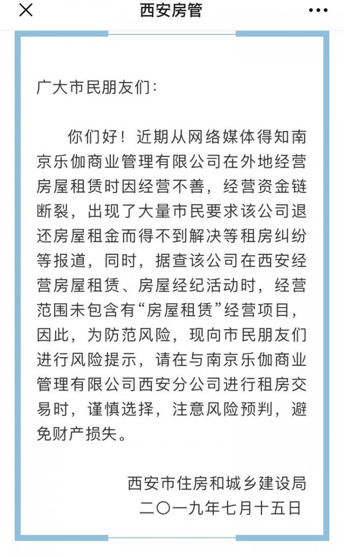 据合肥乐伽租客反映,合肥市市场监督管理局已监测到乐伽账户资金异常,一旦形成书面材料,经侦方面则可以立案调查;西安市住房和城乡建设局官网已在7月15日挂出《关于南京乐伽商业管理有限公司西安分公司的风险提示》,称“据查该公司在西安经营房屋租赁、房屋经纪活动时,经营范围未包含有‘房屋租赁’经营项目”,提醒广大西安市民注意风险预判,避免财产损失。