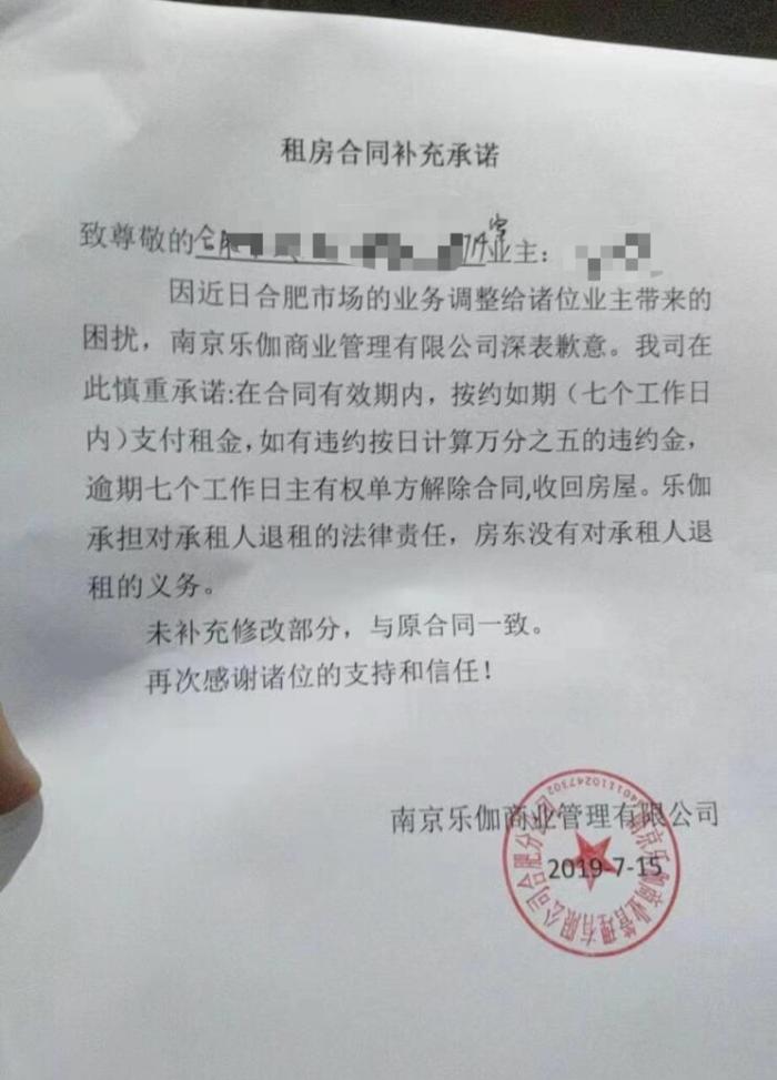 事实上,被乐伽南京总部派去合肥处理相关事宜的员工“陈宝”在7月16日晚上就彻底“失联”了,其在7月17日上午发布了一条朋友圈,宣布已从乐伽离职。此前陈宝代表乐伽公寓在合肥与多名房东、租客签署了一份租房合同补充协议,表示在合同有效期内,按约如期(七个工作日内)支付租金,否则按日计算万分之五违约金。