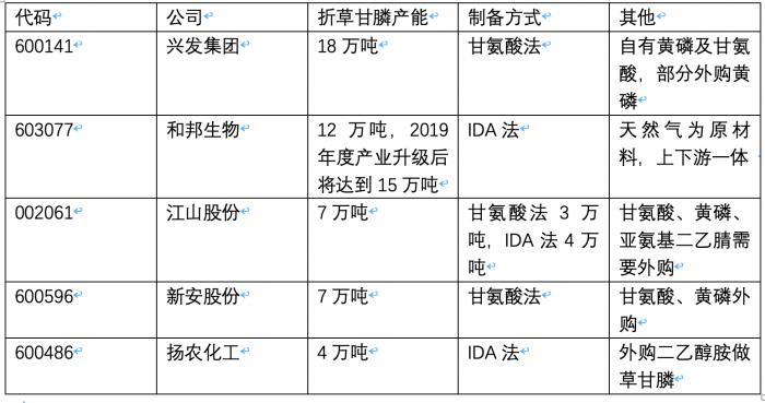 上述两家草甘膦上市公司,不管是在规模上,还是在工艺流程的完整性上,都遥遥领先其他草甘膦上市公司,产能比较上,排名第三的公司连和邦生物50%的产能都不到。且上述两家草甘膦上市公司各据一头,兴发集团是甘氨酸法排名第一的公司,和邦生物是IDA法排名第一的公司。