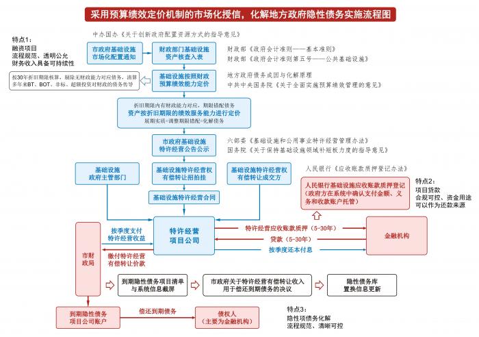 其次,对满足绩效能力、确需财政进行支付的基础设施进行特许经营。地方政府通过招拍挂方式,以15-30年期限,进行基础设施特许经营权有偿转让,收回前期投资资金,定向用于公益性项目的隐性债务偿还。