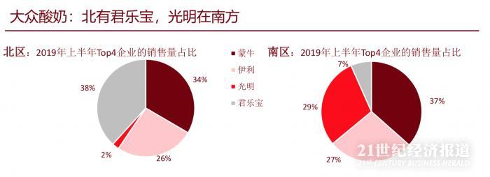 上半年,蒙牛、伊利、君乐宝稳居大众酸奶前三甲。在大众酸奶市场中,蒙牛占整个市场的三分之一市场份额,领导地位明显,伊利、君乐宝紧随其后。2019年上半年,君乐宝销售额出现了逆势上涨的现象。大众酸奶基本为低温酸奶,由于冷链技术的原因,南部地区市场和北部地区龙头企业差异较大。君乐宝在北部地区市场处于领导地位,并保持稳定的增长趋势,而南部地区市场变化较大,整体呈现出下滑趋势。自2018年下半年起光明失去了在南部地区市场的领先地位,被蒙牛反超。