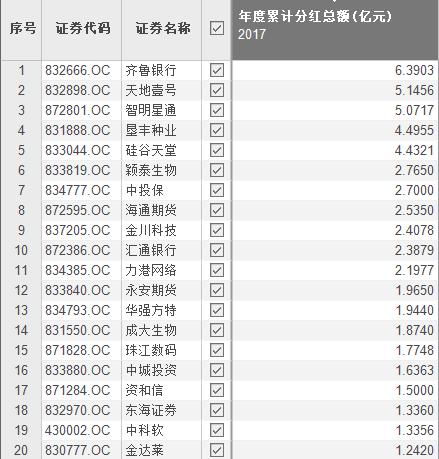 下图为2017,2018年两个年度新三板市场分红TOP20