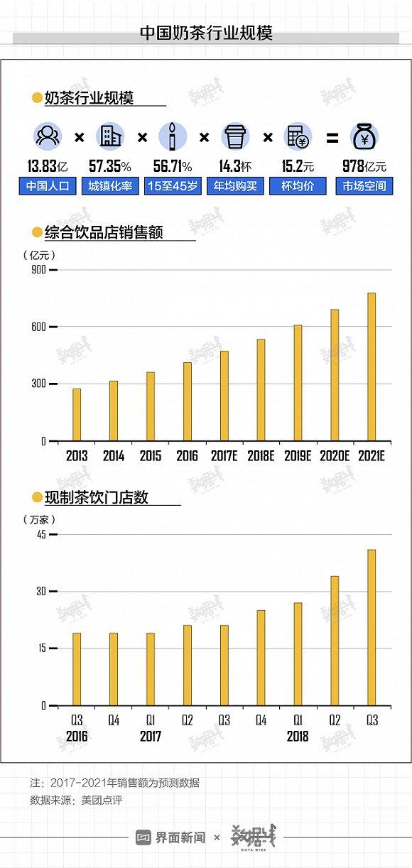 根据美团点评估算,中国奶茶行业规模接近千亿。2017年,国内综合饮品店销售额达472亿元,预计2021年达到779亿元。