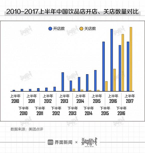 因为门槛低,同质化严重,在奶茶门店数快速增长的同时,也有大量的店铺关闭。根据美团点评数据,从2016年下半年开始,饮品店关店数量开始超过开店数量,2017年上半年饮品店关店数量是开店数量的1.3倍。