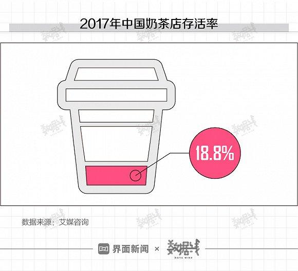 此外,艾媒咨询数据显示,2017年中国奶茶店存活率仅为18.8%,不足二成。