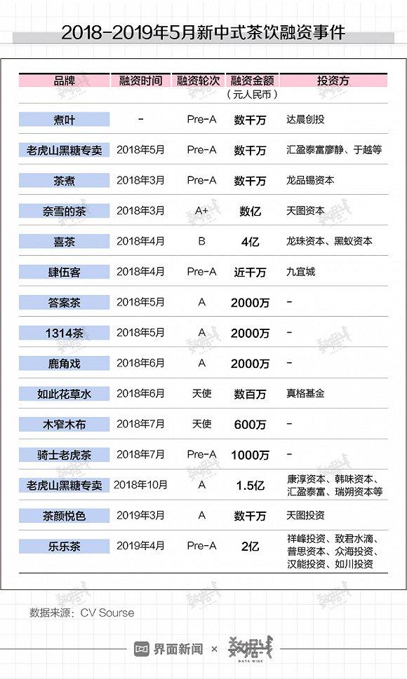 CV Sourse数据显示,从2018年到2019年5月,新中式茶饮的融资事件至少有15起,且数额普遍偏大。头部的新中式茶饮标的成了各家消费类投资机构争抢的阵地。