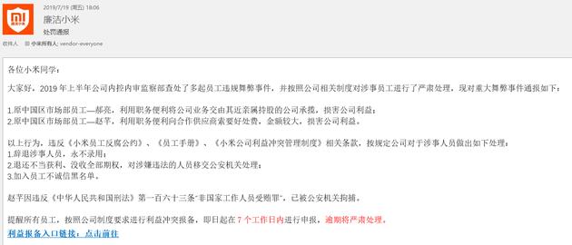7月19日,小米公司发布内部通报邮件称,2019年上半年,公司内控内审监察部查处了多起员工违规舞弊事件,并按照公司相关制度对涉事员工进行了严肃处理。此次通报中涉及2人,均为小米市场部员工。