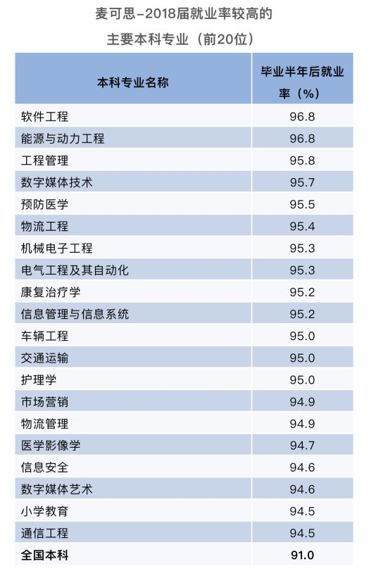 而第三方社会调查机构麦可思研究院日前发布的《2019年中国大学生就业报告》的最新数据显示,2019就业率最高本科专业为,软件工程专业和能源与动力工程专业就业率最高,均为96.8%,其后是工程管理专业(95.8%)。其中,信息安全、软件工程、网络工程、通信工程、数字媒体艺术蝉联三届。在2015年高考志愿热门专业中仅车辆工程、通信工程、还榜上有名,就业率分别在95%和94.5%,位列第11名和20名。