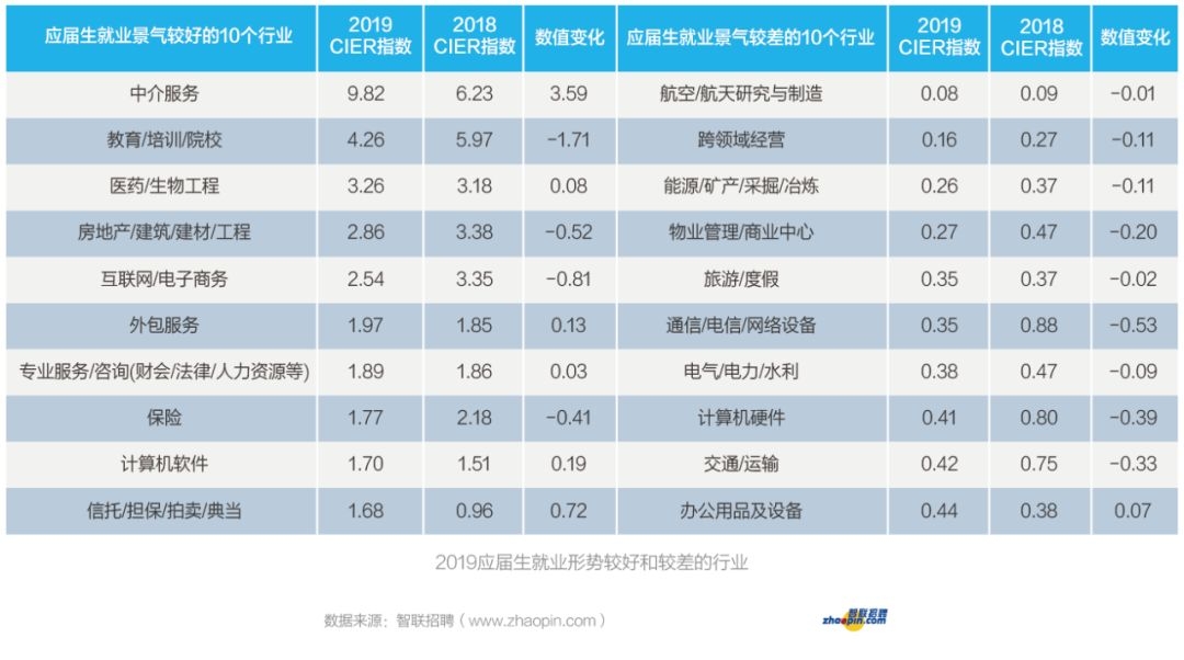 据智联招聘2019年大学生求职指南数据显示,2019年大学生在不同行业的就业景气度情况。就业形势最好的行业依然是中介服务,CIER(中国就业市场景气)指数比去年同期高3.59,涨势迅猛。从供需两侧来看,这一行业的需求人数同比上升25%,求职人数下降了21%,中介服务行业的快速发展持续释放招聘需求,但不管是应届生还是社招群体,都对这一行业的就业体验认可度不高,投递行为不积极。