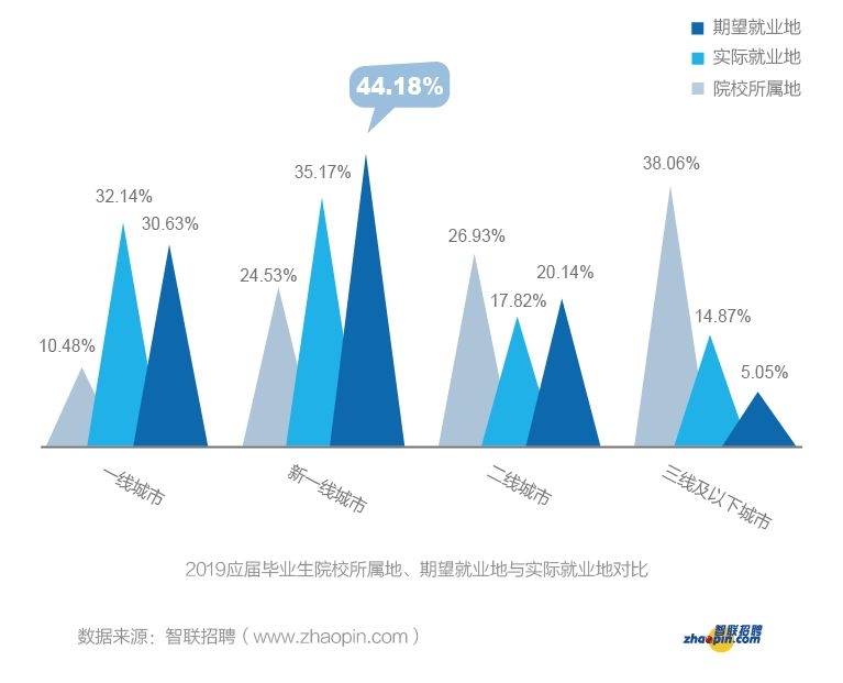 据智联招聘2019年大学生求职指南数据显示,2019应届毕业生期望就业地比例最高的依旧是“新一线”城市(如杭州、宁波、天津、南京等),占比为44.18%,同比上升4.00个百分点。一线城市吸引力也在上升,30.63%的受访大学生期望在一线城市就业,占比高于去年,不管顶着多大的生存压力,一线城市依然是年轻人追逐梦想的主要战场。结合实际签约的数据看,占比最高的也是“新一线”城市:如,占比35.17%,一线城市签约占比为32.14%,与期望结构一致。