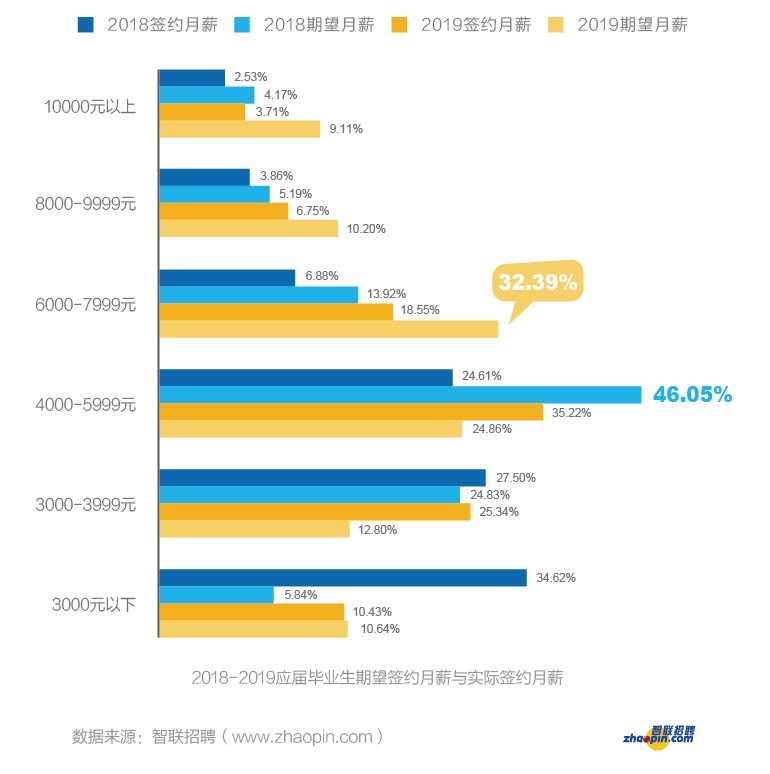 智联招聘数据显示,2019应届毕业生期望月薪集中在6000-7999元,占比最高,达32.39%;4000-5999元之间占比24.86%。对比2018年,毕业生对未来薪酬的预期有所提高。