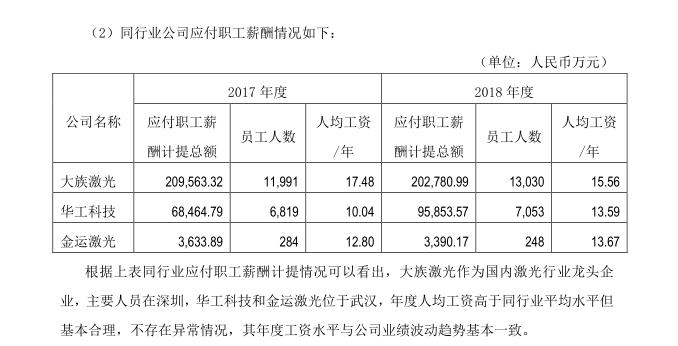 大族激光指出,公司作为国内激光行业龙头企业,主要人员在深圳,华工科技和金运激光位于武汉,年度人均工资高于同行业平均水平但基本合理,不存在异常情况,其年度工资水平与公司业绩波动趋势基本一致。