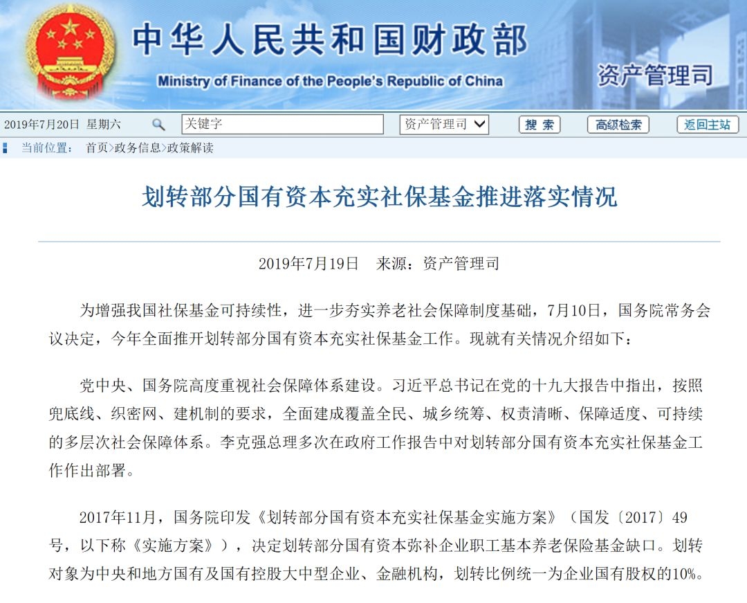 7月19日国务院召开政策例行吹风会,财政部资产管理司司长陆庆平表示,近期将对35家中央管理企业实施国有资本划转充实社保,下一步,财政部将会同其他多个部门,全力推动全国划转工作。
