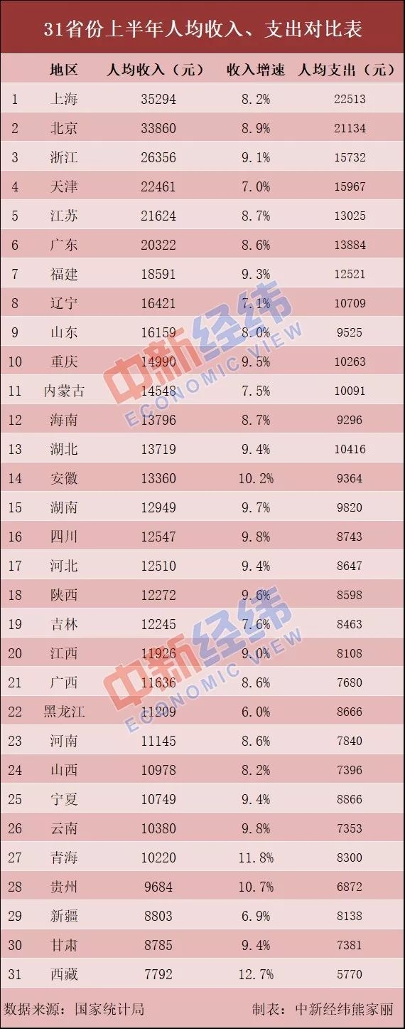 根据国家统计局的数据,上海市上半年居民人均可支配收入居首,为35294元,同比增长8.2%,北京则以33860元紧跟其后,增速则比上海略高,为8.9%。