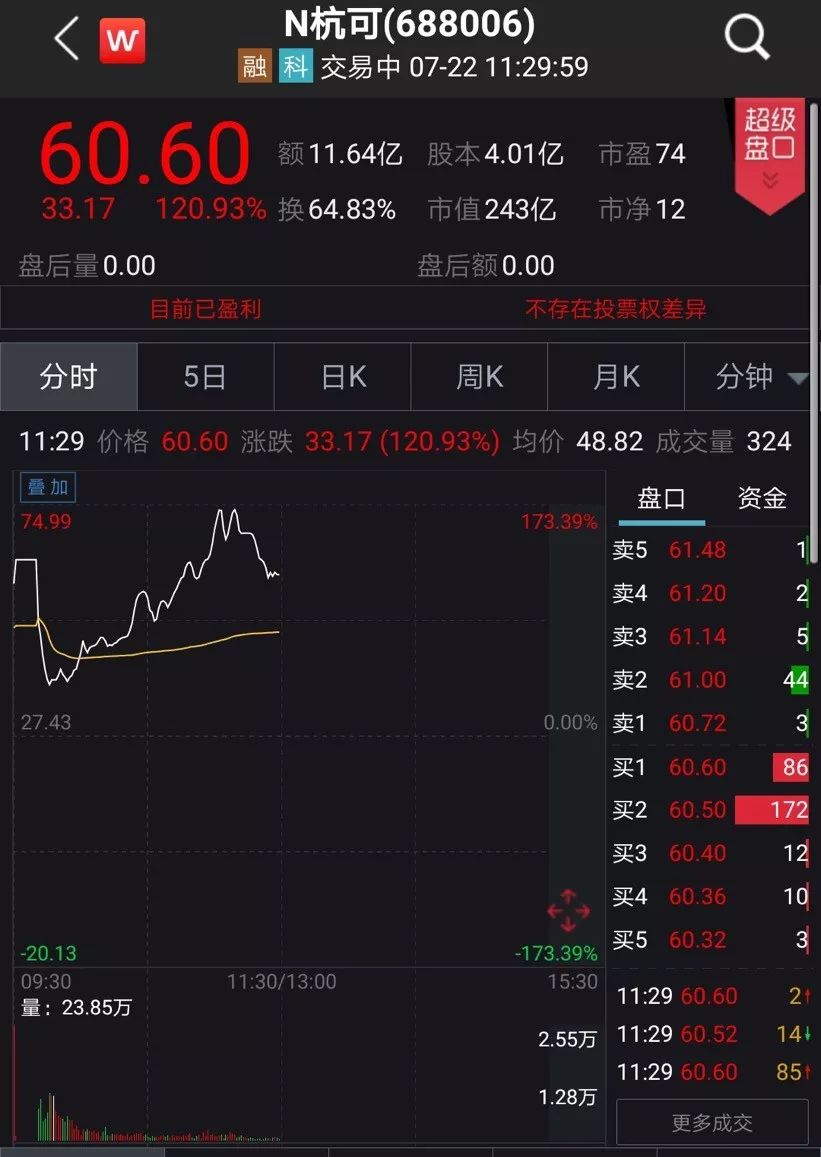 截至中午收盘,杭可科技涨幅为120.93%,报60.6元/股。以最新总市值243亿元,曹骥、曹政父子持股市值169.34亿元。