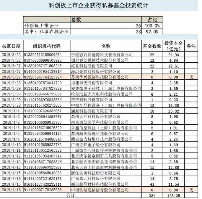 经中国证券投资基金业协会初步统计,首批25家科创板企业中,除华兴源创、中国通号外,其余23家企业都得到了私募基金的投资支持,占比达92.0%。私募基金在投产品共231只,为23家科创企业提供资本金约128亿元。