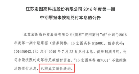 7月22日收盘后,宏图高科公告称,“16宏图高科MTN001”应于7月22日兑付本息,截至到期日终,公司不能按期足额偿付本息,已构成实质性违约。