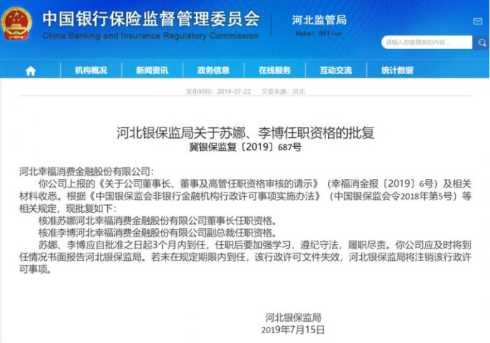 7月22日,河北银保监局官网发布一则关于苏娜、李博任职资格的批复,核准苏娜河北幸福消费金融股份有限公司(后称“幸福消费金融”)董事长任职资格,核准李博河北幸福消费金融股份有限公司副总裁任职资格。