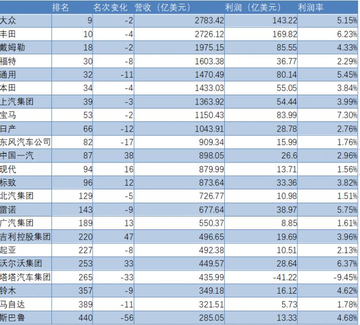 在入榜的23家整车企业中,有17家排名较去年下滑,只有6家排名增长,其中包括一汽、广汽和吉利三家中国车企。此外,印度塔塔汽车集团则是入围500强榜单中的整车企业中唯一出现亏损的企业,2018年塔塔汽车集团亏损高达44.12亿美元。