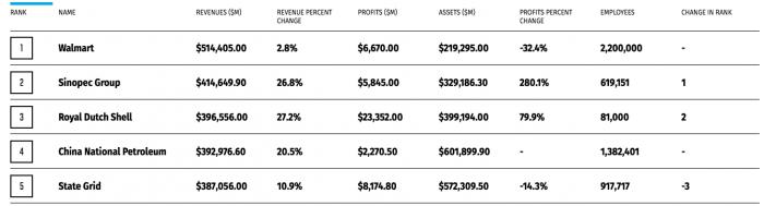 7月22日,《财富》杂志发布了2019年世界500强排行榜,沃尔玛、中国石化、壳牌、中国石油、国家电网分列前五。《财富》杂志每年均会发布“财富世界500强”榜单,并以各企业的年度收入及净利润为评选准则。