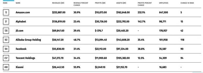 在榜单中,小米被定义为“互联网服务和零售”行业企业,该分类中共有7家企业,分别是排名第13位的亚马逊、第37位的谷歌母公司Alphabet、第139位的京东、第182位的阿里巴巴、第184位的Facebook、第237位的腾讯以及此次入榜的小米。