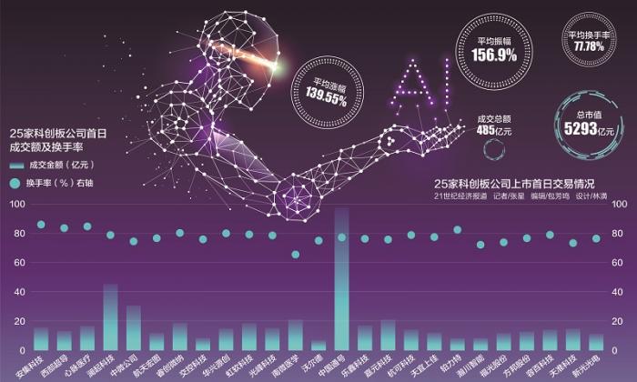 统计显示,收盘时,25只科创板股票平均涨幅约140%,合计成交近485亿元。安集科技涨幅最高,达到400.2%,中国通号的市值一举过千亿,跻身沪深两市个股总市值的第71位。