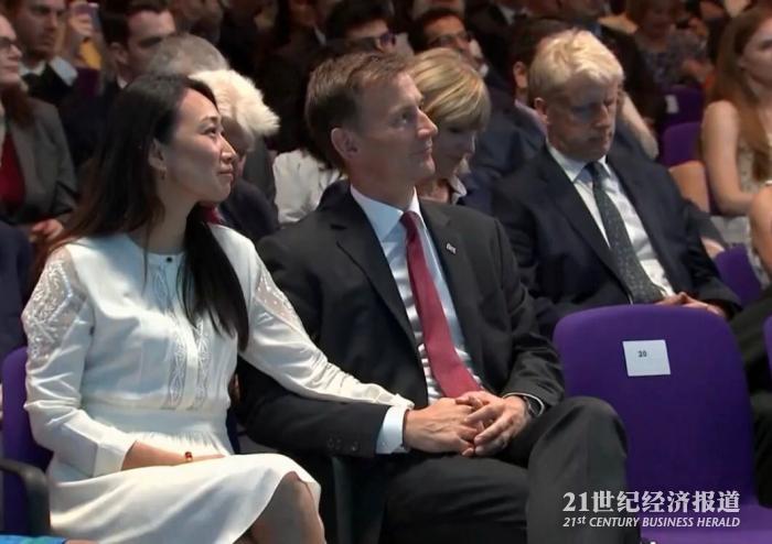 亨特与华裔妻子在台下聆听离开他身旁空座的对手讲话。在约翰逊上台前,亨特第一个向他表示祝贺,友好地握手拍肩,似乎已嫌隙尽化。