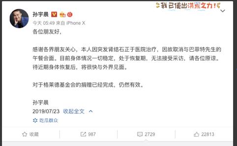 距离巴菲特午餐见面会还有两天,7月23日一早,“波场少年”孙宇晨却在个人认证微博上突然发布消息称,因突发肾结石在医院治疗,因故取消与巴菲特午餐会面。