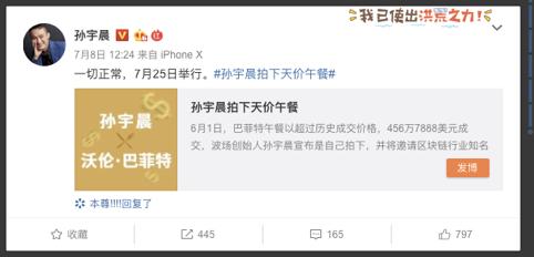 自6月4日宣布以456万美元(超3100万元人民币)天价竞拍下巴菲特午餐,孙宇晨在微博上便十分活跃。7月8日时,他一度还辟谣巴菲特午餐取消,称会如期举行。甚至因为美国总统特朗普表明不看好虚拟货币领域,孙宇晨称要邀请特朗普一起参加巴菲特午餐。记者注意到,在宣布拍下巴菲特午餐开始,“巴菲特午餐”已经沦为孙宇晨的“巨型广告牌”。