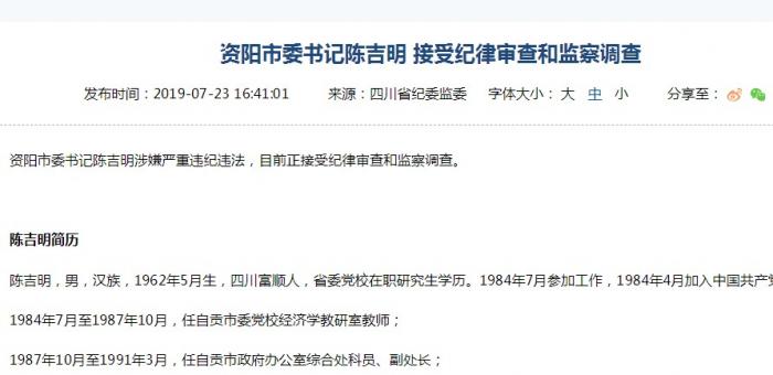 在陈吉明接受调查的前一日,即7月22日,其还正常主持召开了资阳市委的常委会。7月23日的《资阳日报》称,该会议传达学习四川省的全省县域经济发展大会、川渝经济社会发展全面合作座谈会精神,研究资阳市贯彻落实意见。