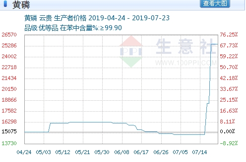 证券时报·数据宝统计显示,在7月初,黄磷价格还仅仅在每吨1.4万元—1.5万元的价格区间徘徊,半个月时间上涨了差不多整整10000元/吨。据生意社数据,7月22日,国内黄磷市场高位运行为主,市场交投气氛一般。目前国内黄磷主流价格在25000-26000元/吨左右。因环保检查影响,黄磷现阶段开工率低下,市场黄磷供应紧缺,而多数磷酸企业停产停报,商家基本维持老客户订单,或停止采购黄磷。预计黄磷价格在短时间内仍将维持高位运行为主,涨幅较为有限。