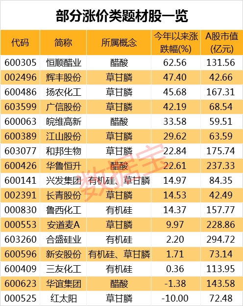 涨价主题一直是A股一道亮丽的风景线,数据宝收集了一份有机硅、草甘膦、醋酸的概念股名单。