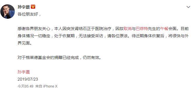 微博中,孙宇晨称,“感谢各界朋友关心,本人因突发肾结石正于医院治疗,因故取消与巴菲特先生的午餐会面。目前身体情况一切稳定,处于恢复期,无法接受采访,请各位原谅。待近期身体恢复后,将很快与外界见面。”