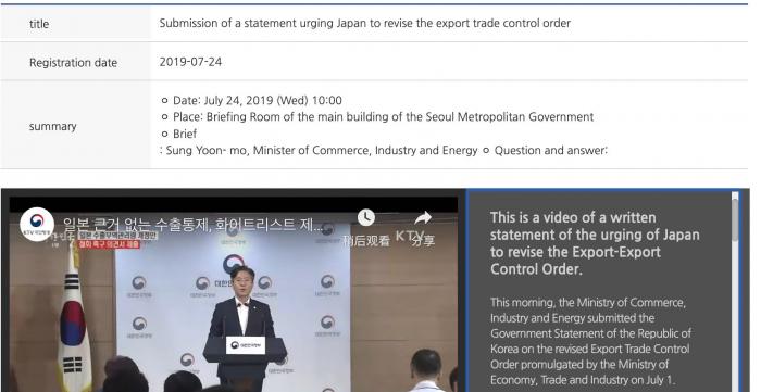 韩国产业通商资源部网站显示,当地时间7月24日上午,韩国产业通商资源部长官成允模在韩国首尔召开记者发布会,表示就日方近期针对韩方实施的贸易管制,会前已向日本经济产业省的电子邮箱发送了长达15页的意见书。