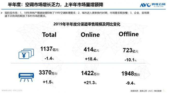 奥维云网白色家电事业部认为,房地产增速放缓抑制了2019年空调新增需求。同时,城市市场进入更新换代时期,需求释放慢;企业、卖场的渠道下沉有效释放了农村市场需求;上半年企业大促频繁,刺激市场需求等原因也对空调市场的增量造成了一定的影响。